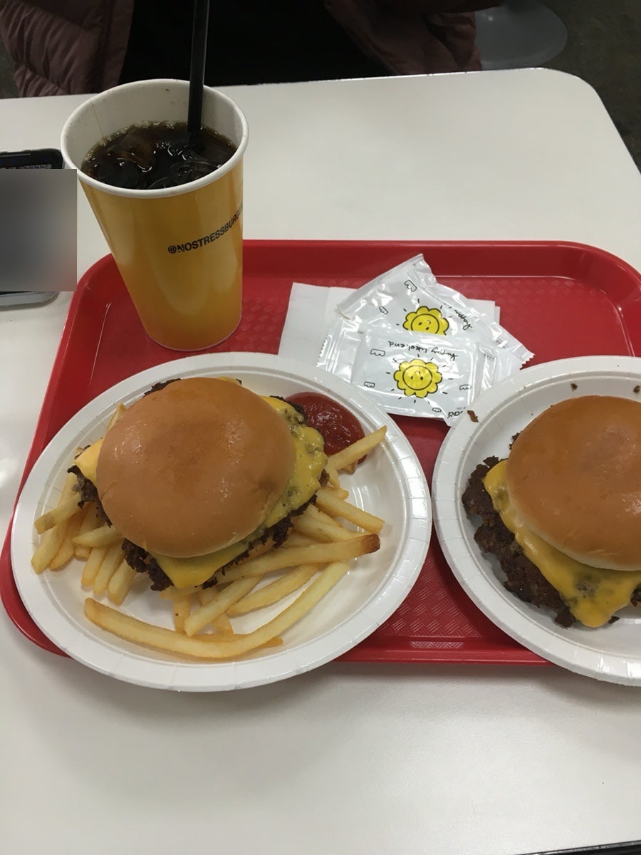 그래도 안 올라갔던 입꼬리가 햄버거 한 입 먹고 올라감